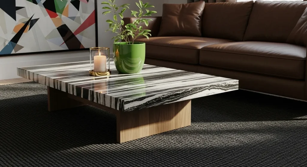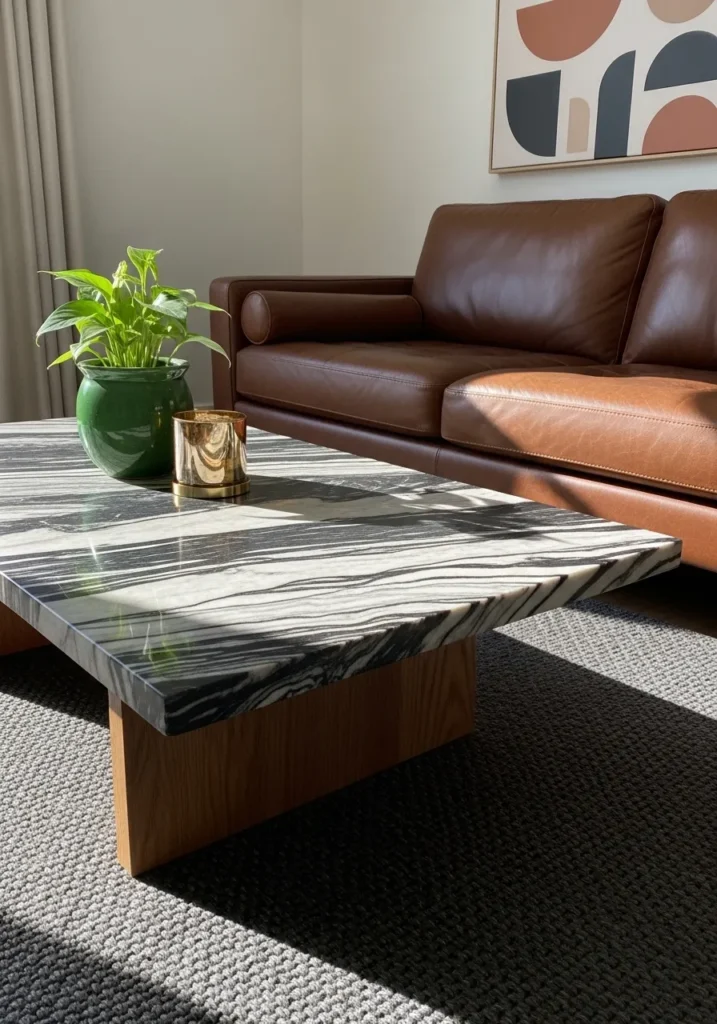 This piece makes a bold statement by pairing a thick slab of heavily striped black and white marble with a warm light oak foundation. The stone has a rhythmic linear pattern that creates a sense of movement across the surface, making it the undisputed star of the living room. It sits at a comfortable height against a rich cognac leather sofa and a chunky charcoal knit rug. The sharp, clean edges of the tabletop offer a wonderful contrast to the organic shapes in the abstract wall art and the lush green plant perched on top.