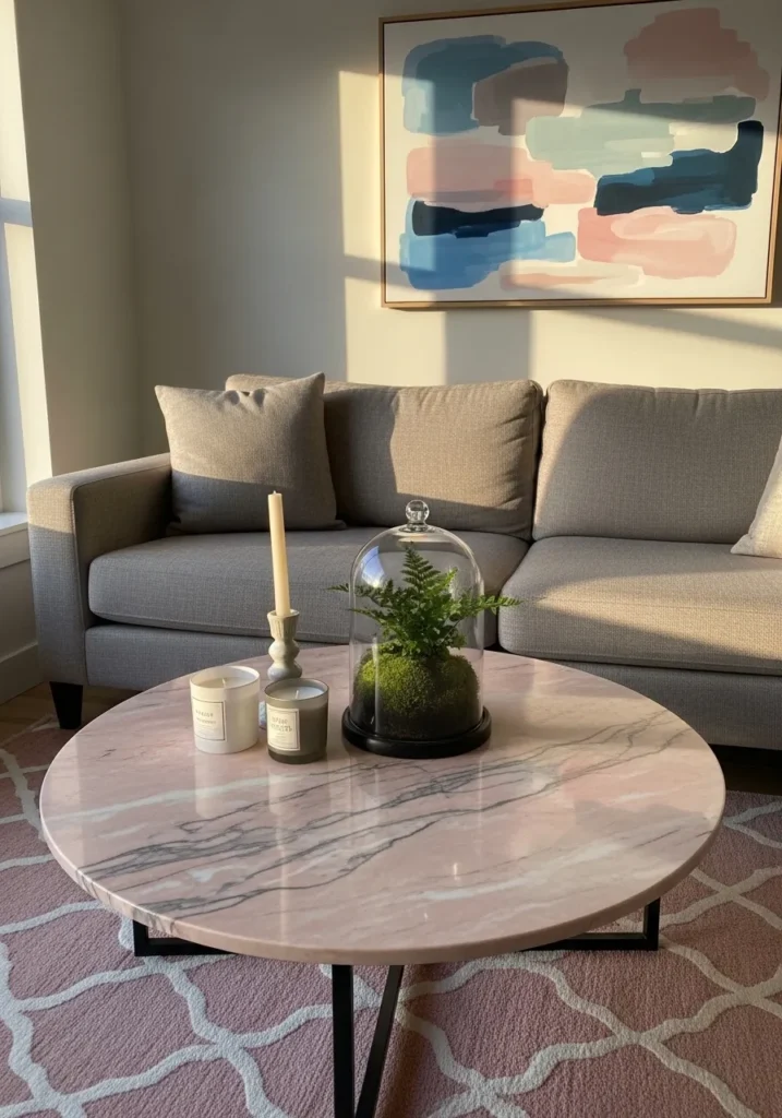 This dreamy living area revolves around a circular coffee table featuring a rare, blush-toned marble top with delicate grey veining. The stone rests on a slim black metal base that keeps the look light and airy, preventing the large surface from feeling too heavy in the room. To tie the palette together, the space includes a patterned pink rug and a colorful abstract painting that echoes the soft pastels of the tabletop. A glass cloche housing a vibrant green fern adds a touch of life and nature, creating a serene and feminine focal point.