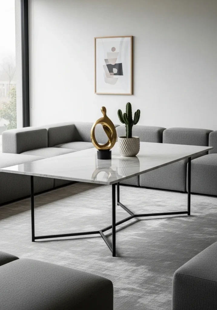 This ultra-sleek living area celebrates clean lines and a restrained color palette. A sprawling rectangular white marble table takes center stage, supported by a thin black metal frame that forms a unique tripod-style base. The polished surface reflects the soft light pouring in from large windows, highlighting the subtle grey veins in the stone. Tucked into a corner, a low-profile grey sectional sofa wraps around the space, providing a grounded feel. A striking gold sculpture and a potted cactus add a tiny splash of warmth and personality to the otherwise cool, modern environment.