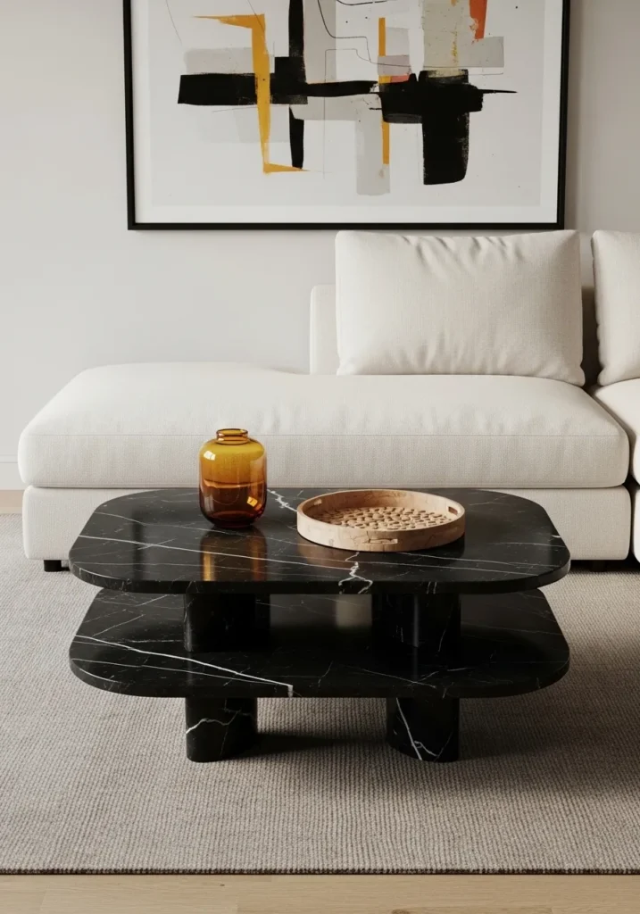 This living area is all about high-contrast drama and sophisticated shapes. The standout piece is a two-tier coffee table crafted from deep black marble with jagged white veining that looks like frozen lightning. It has rounded rectangular edges and sits on chunky cylindrical legs made of the same luxurious stone. A bright white sofa provides a clean backdrop while a wooden tray and an amber glass vase add just enough warmth to keep the space from feeling too cold.