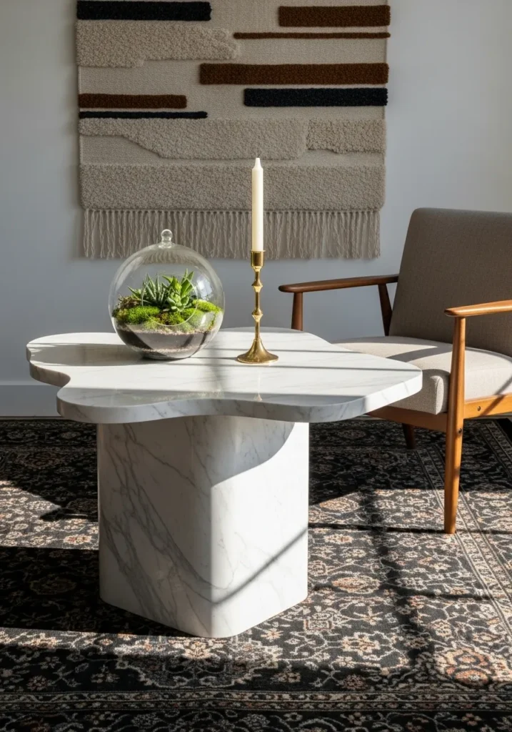 I’m loving how this unique shape breaks up the usual straight lines you see in most living rooms. It feels like such a fresh way to incorporate luxury into a smaller corner without it feeling too formal or stuffy. If you want to add a bit of personality to your reading nook, then a geometric marble piece like this is the perfect way to make it happen.