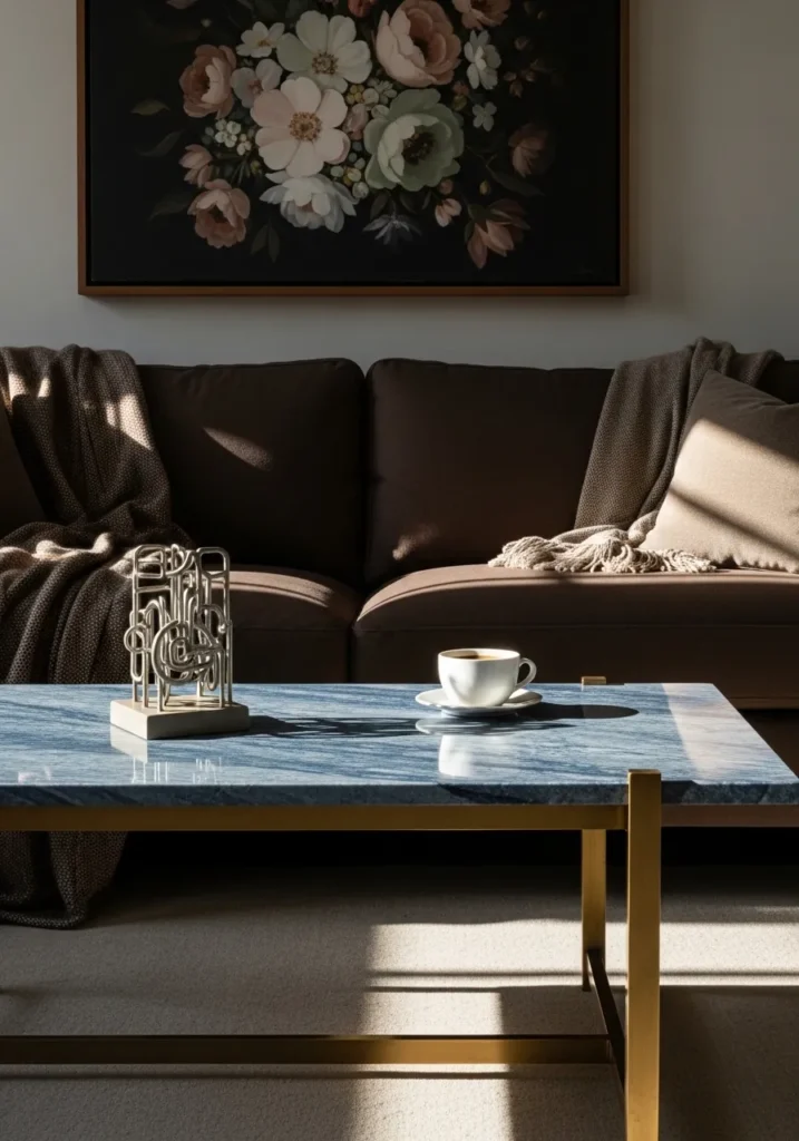 I am completely floored by how that rich blue stone breathes life into such a dark and cozy color palette. It is a brilliant way to add a pop of color without losing that grounded, earthy feel we all crave in a relaxing living room. The gold accents make it feel like a total luxury hotel suite, and honestly, sipping a latte here would make even a Tuesday morning feel like a special occasion.