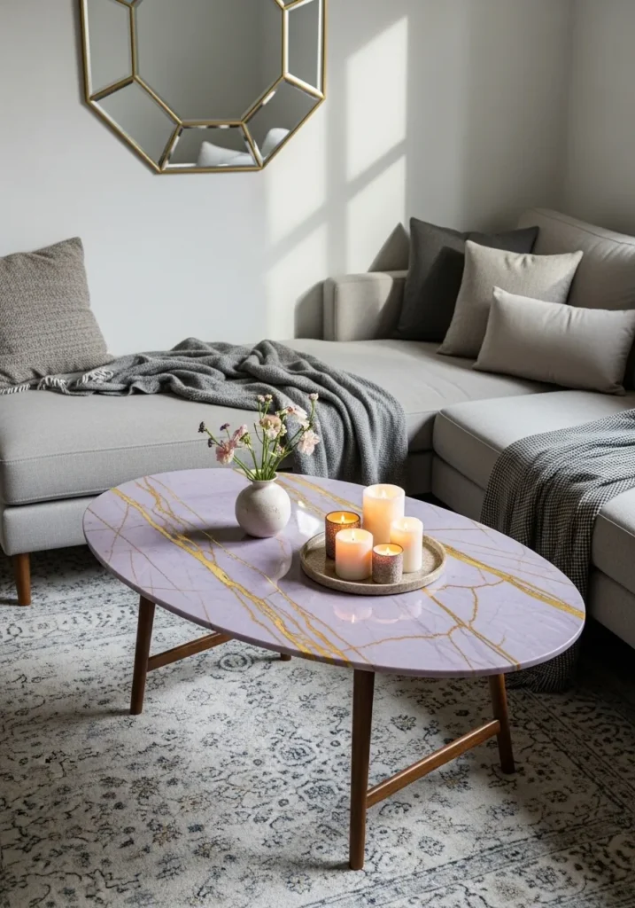 This dreamy living area features an oval coffee table with a rare lilac-colored marble top that instantly brightens the room. The polished stone is decorated with shimmering golden veins that snake across the surface, catching the light alongside a cluster of glowing white candles. It is paired with a slim wooden base that keeps the vibe mid-century and approachable. To complement the violet tones, a light grey sectional sofa is layered with charcoal and silver pillows, while a geometric gold mirror reflects the soft afternoon sun.