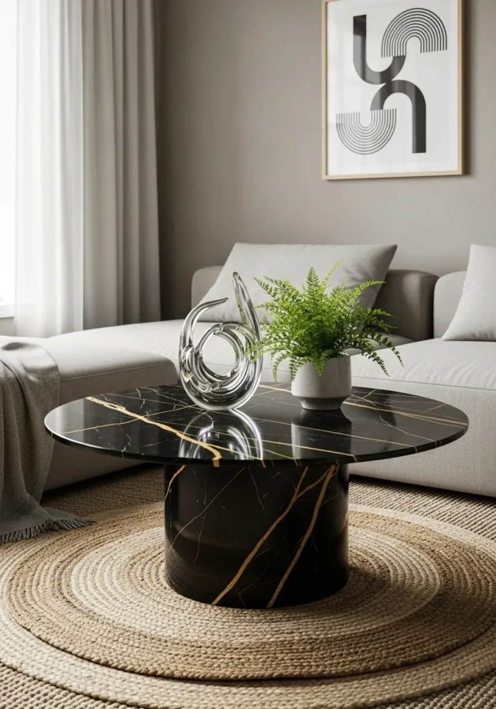 The way those gold streaks catch the light against the deep black background is absolutely mesmerizing. It feels like such a sophisticated way to bring a bit of luxury into an everyday living area without it feeling too precious or untouchable. I’m quite partial to how the round shape of the table mimics the circular pattern of the rug beneath it, creating a very harmonious and balanced vibe. It is definitely the kind of “wow” piece that makes the whole room feel professionally designed.