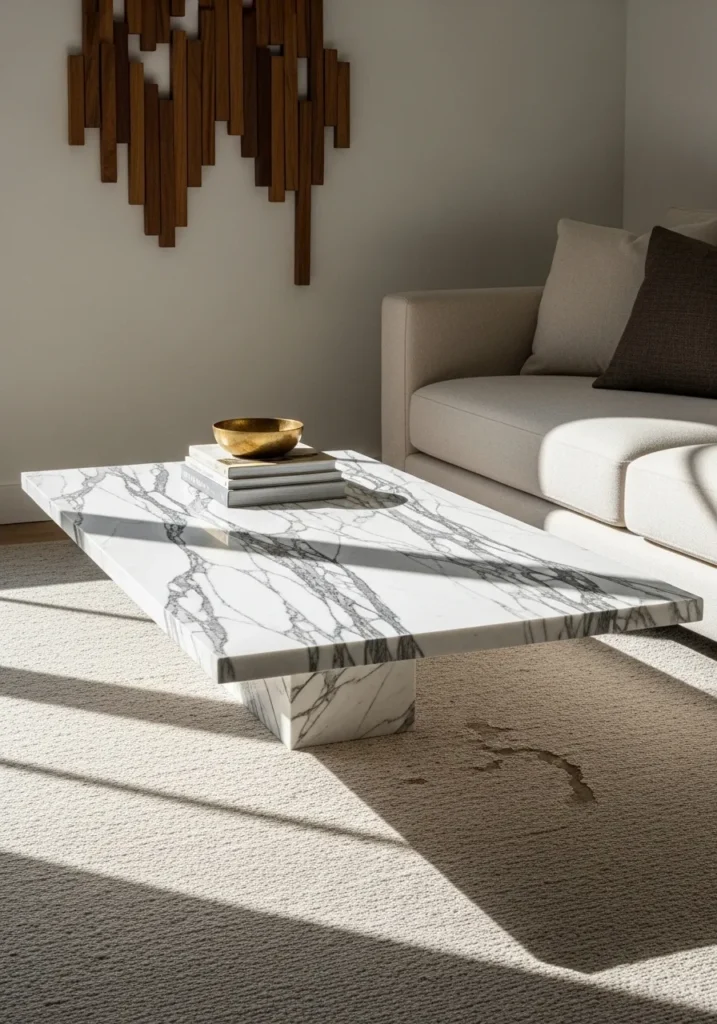 The way this table appears to hover over the floor is a total masterclass in minimalist design. It feels incredibly sturdy and substantial yet manages to keep the room feeling light and spacious. I love how the bold veins in the stone act like a natural painting that ties all the neutral tones in the room together. It is exactly the kind of serene spot where I could see myself spending a quiet Sunday afternoon.