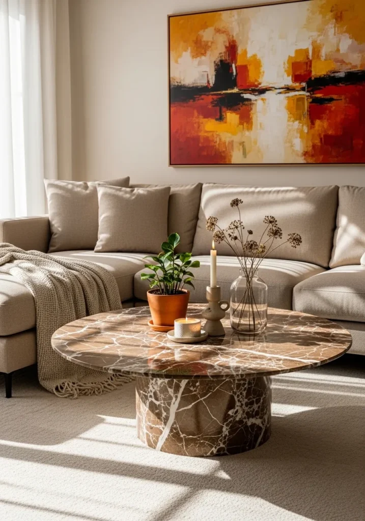 This warm and inviting living area centers around a circular coffee table that boasts a rich chocolate and ochre marble palette. The thick cylindrical base supports a wide matching top, both covered in intricate white webbing that dances across the brownish stone like natural lace. It is set against a sandy-colored sectional sofa and a neutral rug, allowing the deep tones of the marble to truly stand out. A vibrant orange and red abstract painting hangs nearby, perfectly picking up the sunset hues of the stone, while a terracotta potted plant adds a fresh touch of greenery to the tabletop.