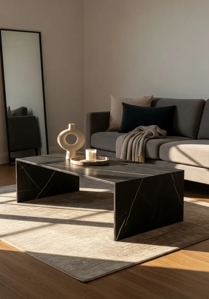 I am seriously crushing on how the moody black stone pops against those cozy neutral layers. It feels incredibly high-end yet welcoming enough for a glass of wine and a long chat. The way the sharp edges of the marble play against the fluffy pillows is pure design magic.