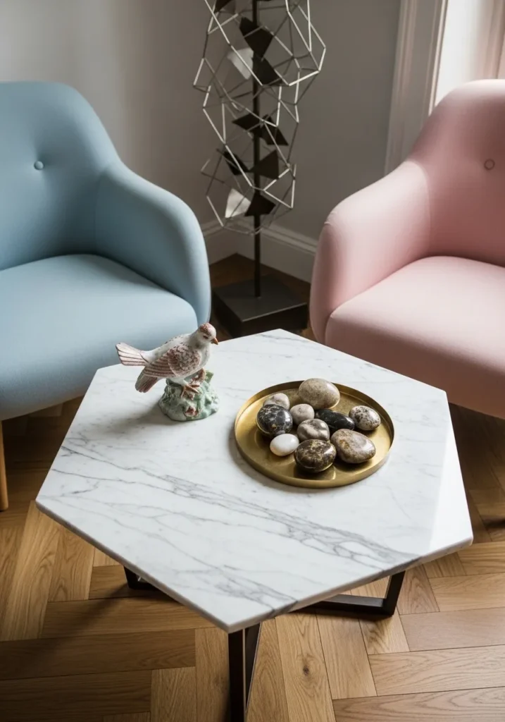 This charming setup features a crisp white marble tabletop cut into a geometric hexagon shape. Delicate grey veining dances across the polished surface, while a slim dark metal base provides a sturdy and modern foundation. It is tucked perfectly between a soft pastel blue armchair and a dusty rose seat, creating a whimsical yet sophisticated conversation area. The addition of a gold tray filled with smooth river stones and a decorative bird figurine adds a playful touch of nature to the sleek stone.