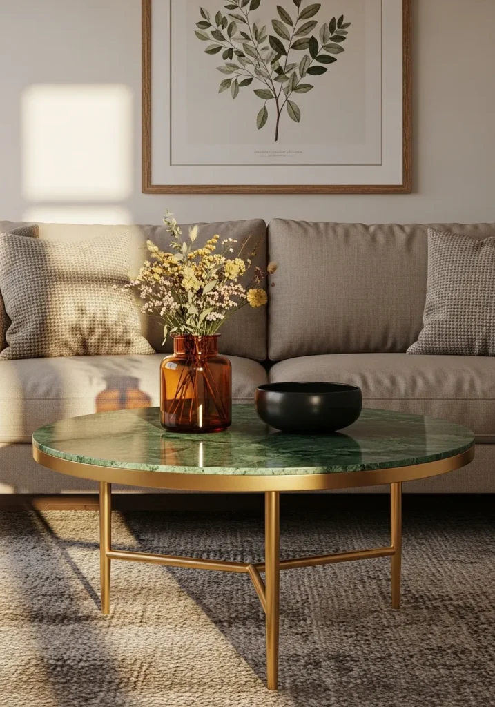 This design features a deep forest green marble top that feels like a slice of a secret garden right in the middle of your living room. The circular stone is held by a slender gold frame that wraps around the edge and extends into thin legs, which gives it an elegant and jewelry-like finish. It rests beautifully against a neutral beige sofa and a textured grey rug, while the amber glass vase filled with dried flowers adds a warm and vintage touch to the overall look.