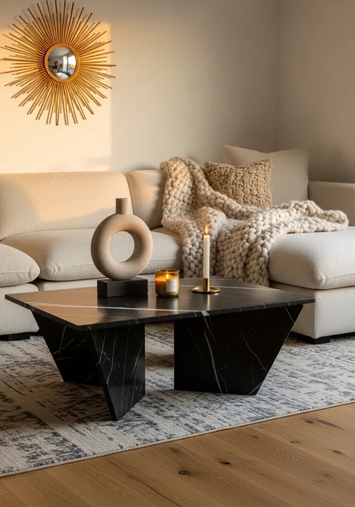 This living space strikes a beautiful balance between soft textures and sharp architectural lines. The focal point is a geometric black marble coffee table with striking white veining that cuts across its dark surface like lightning. It rests on chunky triangular legs that give it a bold and contemporary silhouette. Surrounding this statement piece is a creamy boucle sofa topped with a massive chunky knit throw and a gold sunburst mirror that catches the warm evening glow.