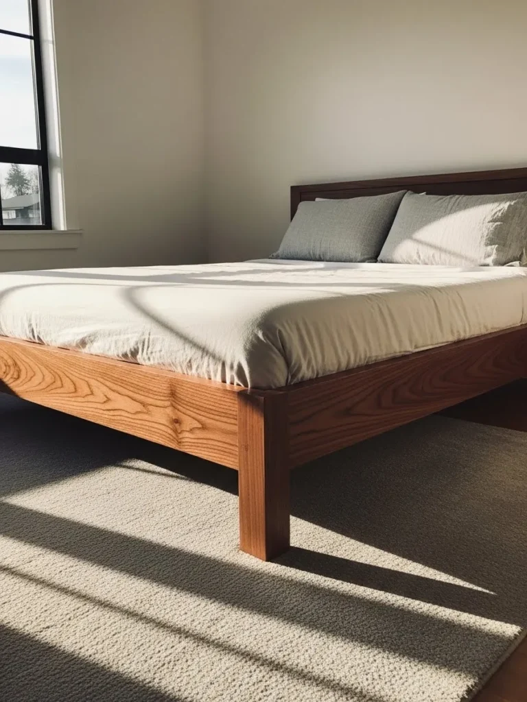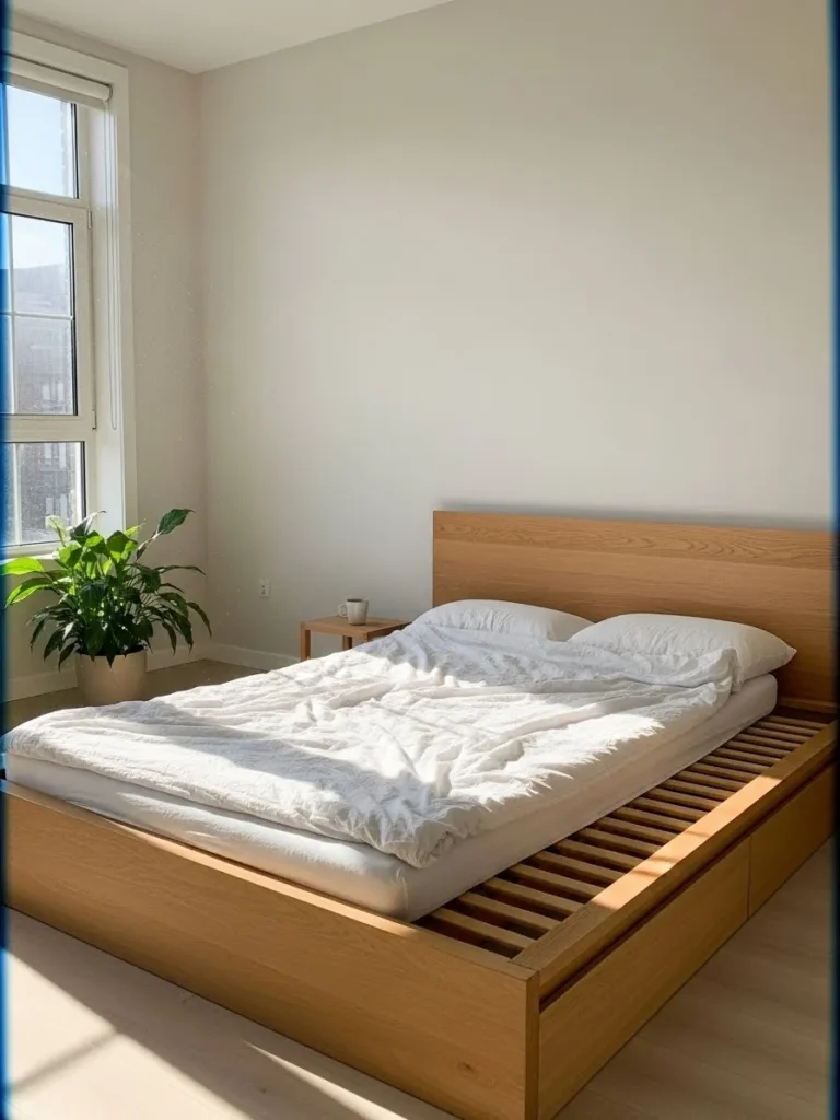 This minimalist bed frame keeps the focus on clean lines and natural wood with a simple rectangular shape and an unfussy headboard. The light wood tone pairs beautifully with crisp white bedding, making the whole space feel bright and open. The raised frame adds a bit of visual lightness while still feeling sturdy and grounded. Soft sunlight across the bed highlights the wood grain and keeps the room feeling calm and uncluttered.