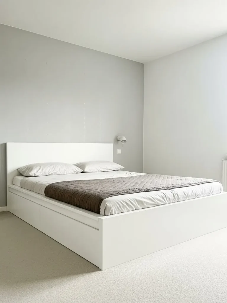 This minimalist bed frame features a smooth all white finish with a solid platform base that feels sleek and uncluttered. The low profile design keeps the room looking open while the simple headboard blends seamlessly into the soft neutral walls. Crisp bedding and a subtle quilt add just a touch of texture without breaking the calm look. Everything feels intentional and quiet which is exactly what minimalist bedrooms do best.