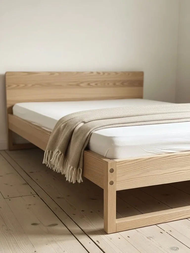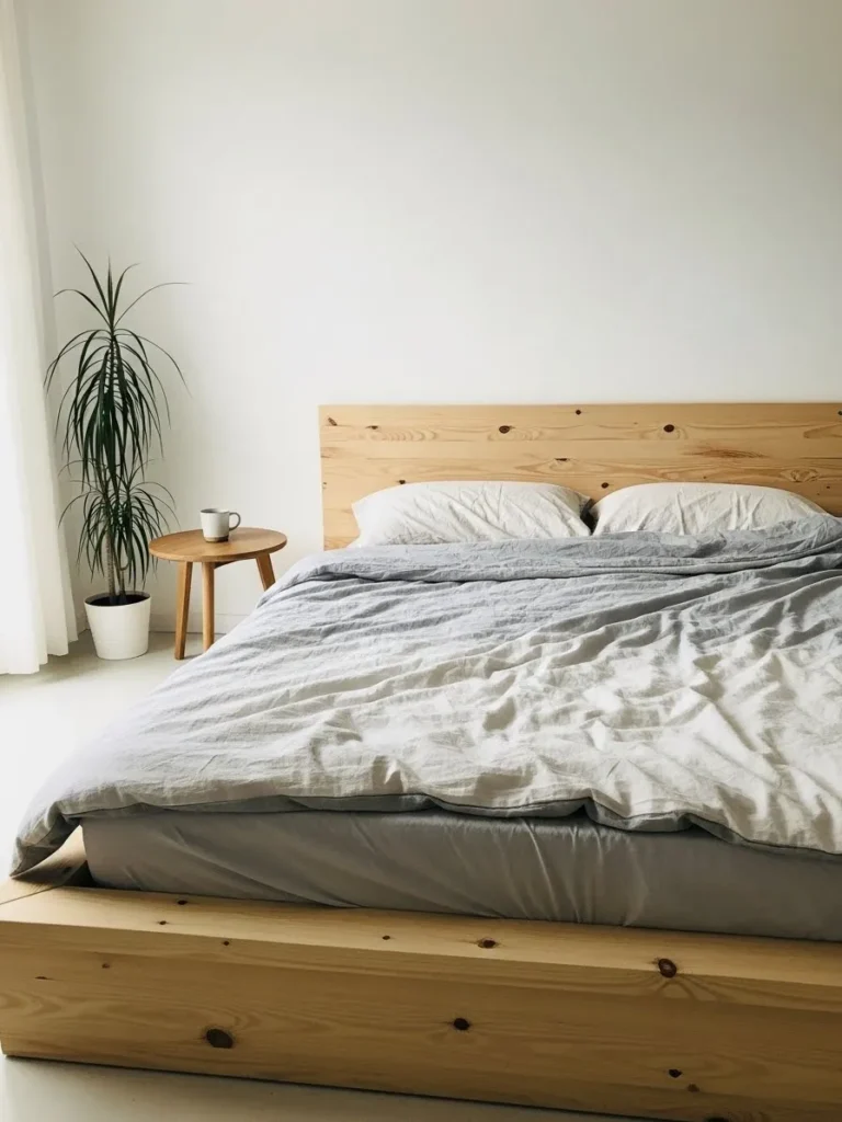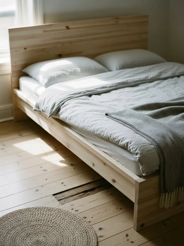 This minimalist bed frame features light natural wood with clean edges and visible joinery that adds quiet character. The low profile keeps the room feeling open while the solid headboard anchors the space without overpowering it. Soft neutral bedding and a simple throw bring in texture without cluttering the look. Everything feels balanced and intentional with a focus on natural materials and calm simplicity.