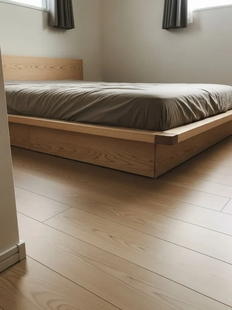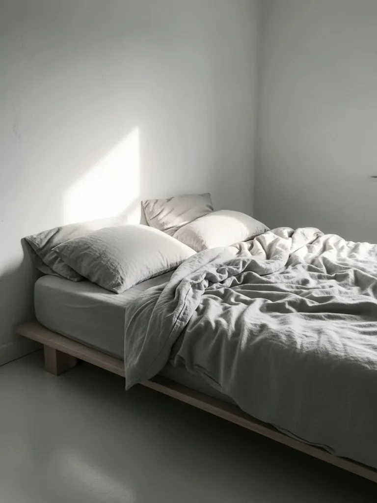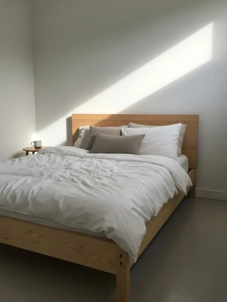 This minimalist bed frame sits low to the ground with a simple wooden base that almost disappears into the space. The clean lines and lack of a visible headboard keep the room feeling open and uncluttered. Soft gray and white bedding adds gentle texture without adding visual noise, while the light bouncing off the walls creates a calm and airy mood. Everything about this setup feels intentional but relaxed.