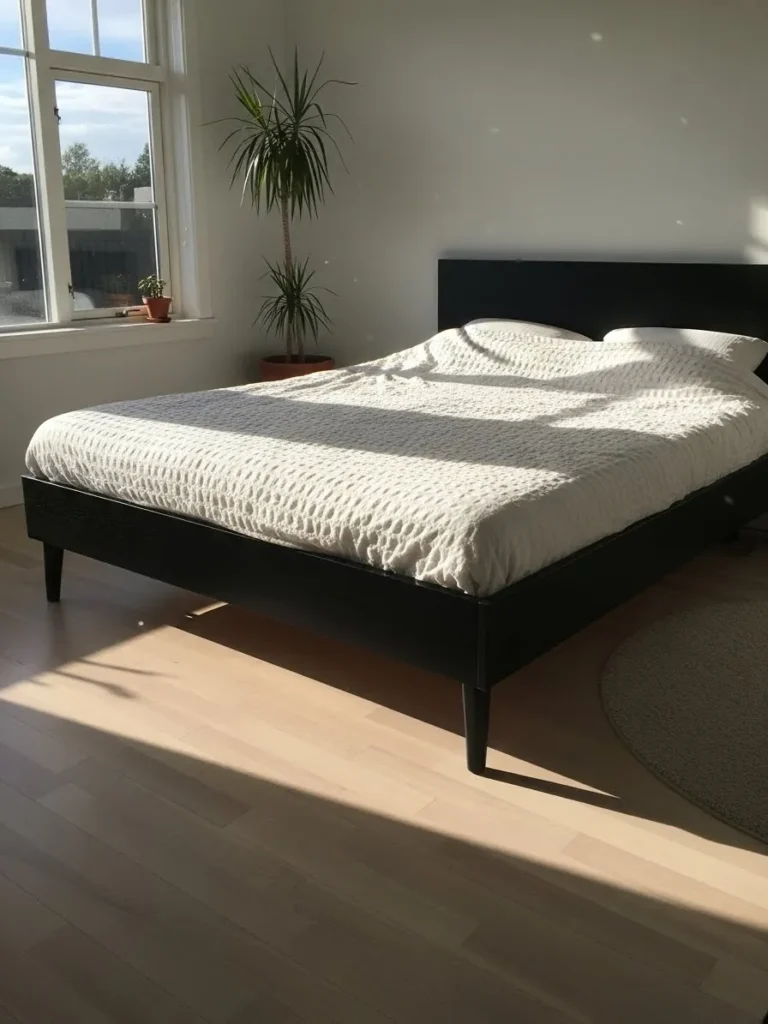 This minimalist bed frame makes a statement with its smooth black finish and clean straight lines. The low profile keeps the look modern and uncluttered while the slim legs lift the frame just enough to keep the room feeling open. Crisp white bedding creates a beautiful contrast against the dark frame, and the simple surroundings let the bed stand confidently on its own. Natural light softens the bold color and keeps the space feeling calm instead of heavy.