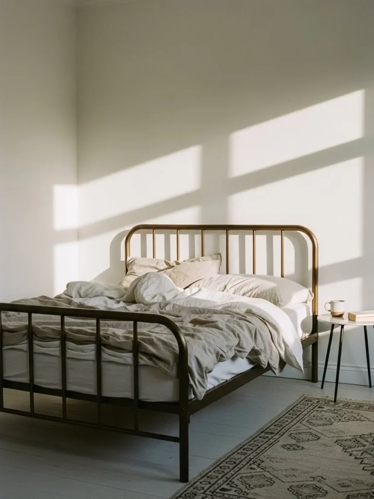 This minimalist bed frame features a slim metal structure with gentle curves and vertical rails that keep the look light and open. The muted metallic tone blends easily into the space without feeling harsh or industrial. Soft layered bedding in warm neutrals adds balance and keeps the overall look cozy instead of cold. The raised frame and airy design allow natural light to move freely around the room, which helps everything feel calm and uncluttered.