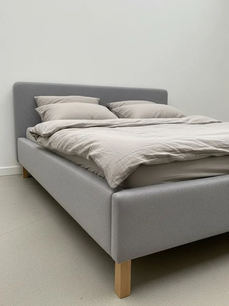 This minimalist bed frame features a smooth upholstered finish in a soft gray tone that instantly makes the space feel calm and polished. The clean rectangular shape keeps the look modern while the padded headboard adds a subtle layer of comfort. Light wood legs lift the frame just enough to keep the room feeling open and airy. Neutral bedding blends effortlessly with the fabric, creating a quiet and cohesive look.