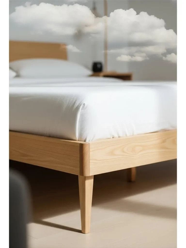 This minimalist bed frame keeps the look clean and airy with smooth light wood and gently tapered legs. The frame sits slightly elevated which helps the room feel open and uncluttered. Crisp white bedding blends seamlessly with the pale wood tones, creating a soft and calming palette. Every line feels intentional and simple, making the bed look balanced and quietly elegant without any unnecessary details.
