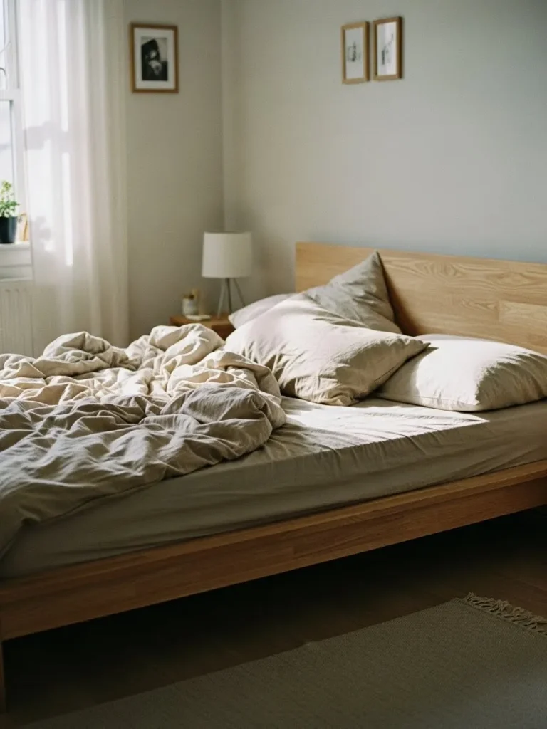 This minimalist bed frame blends clean lines with a warm wood finish that instantly softens the space. The low profile keeps the room feeling open while the simple wooden headboard adds just enough structure without stealing attention. Neutral bedding and relaxed layers give the bed an easy lived in look that feels calm rather than styled. Soft light from the window and a few understated decor pieces keep everything feeling balanced and uncluttered.