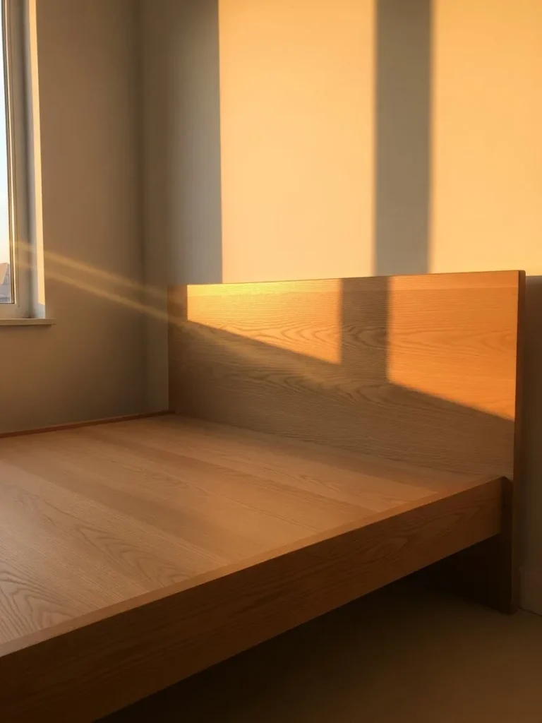 This minimalist bed frame features smooth oak wood and a simple blocky silhouette that feels sturdy and serene. The wide headboard adds a sense of balance while the low profile keeps the room feeling open and uncluttered. Warm sunlight hitting the wood highlights its natural grain and gives the whole setup a soft glow. There are no extra details competing for attention which makes the design feel clean and intentional.