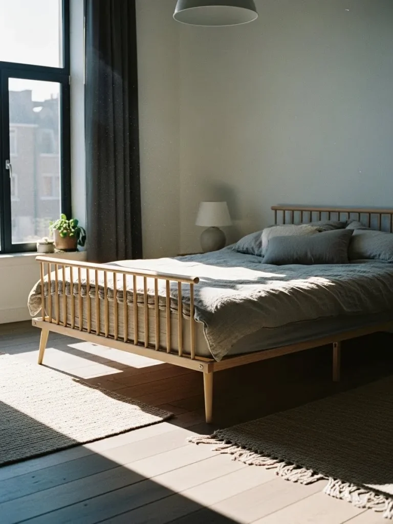 I really love how honest and peaceful this bed feels. There is something so comforting about seeing the natural wood and simple construction without anything hidden or overdone. It feels like the kind of bed that lets the room breathe and helps your mind slow down. This is minimalist style that feels warm and welcoming instead of cold or strict.