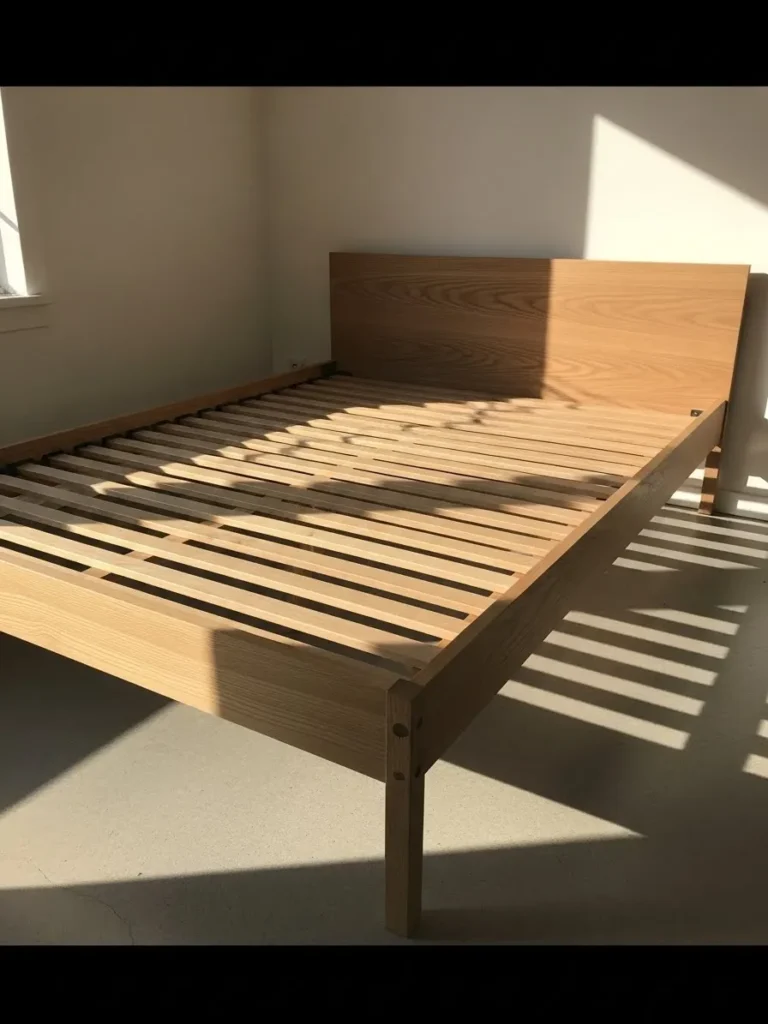 This minimalist bed frame strips everything back to the essentials with clean wooden slats and a solid wood headboard. The exposed slat base keeps the design light and breathable while showing off the natural grain of the wood. Straight legs and a simple rectangular shape give it a grounded feel without adding visual clutter. Sunlight casting soft shadows across the frame adds depth and warmth while keeping the overall look calm and unfussy.