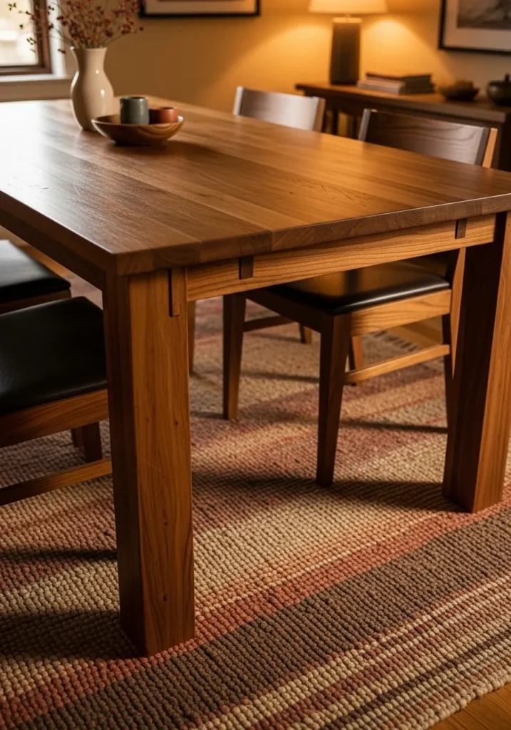 This dining space features a sturdy dark wood table paired with warm textiles underfoot and softly glowing lamps nearby. The thick legs and solid construction give the table a strong presence while the surrounding elements soften the overall look. The room feels grounded and comfortable.