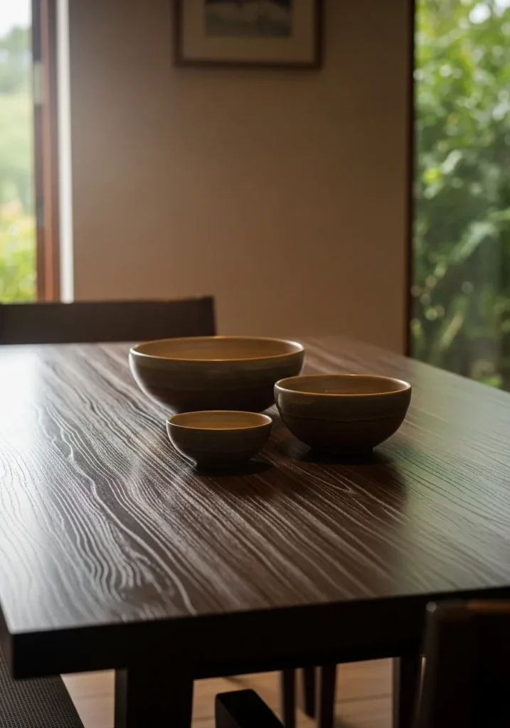 This dining table showcases a smooth dark wood surface styled with minimal ceramic bowls that let the natural grain take center stage. Soft light from nearby windows adds warmth and depth without overpowering the simplicity of the space. The overall look feels calm and intentional.