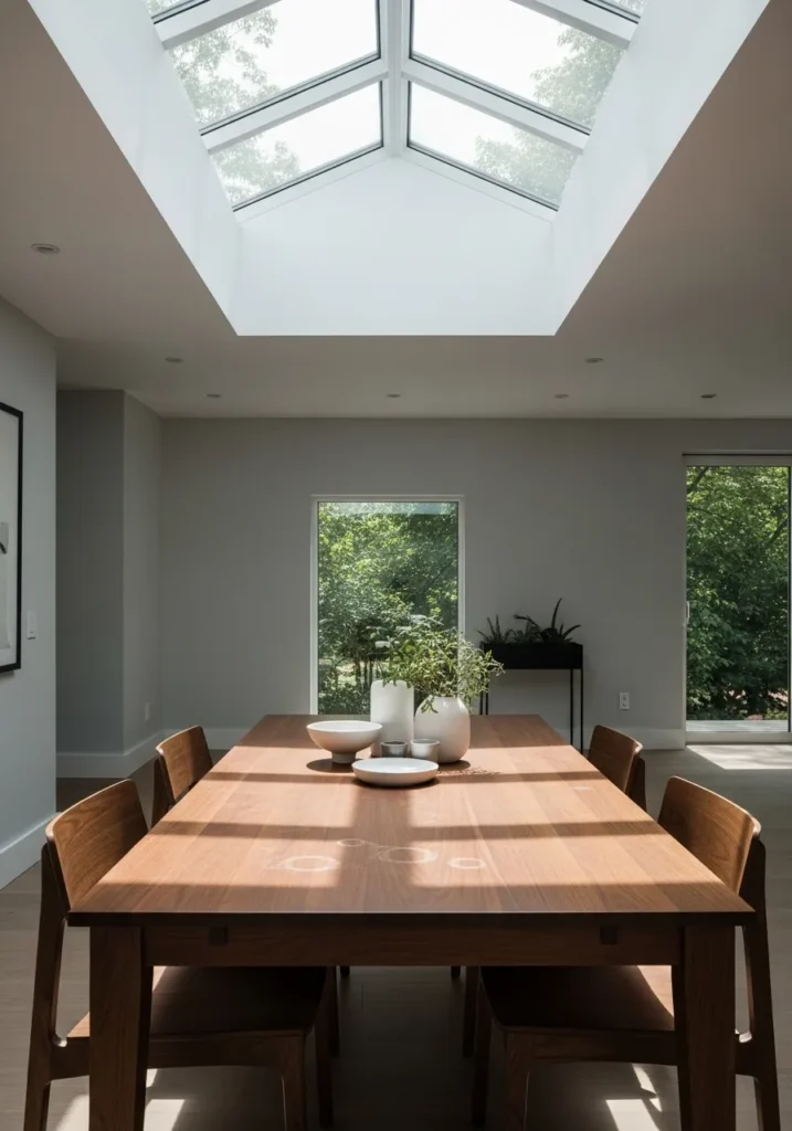 This dining area places a rich dark wood table beneath a skylight that fills the room with natural light from above. The clean lines of the table and chairs keep the look modern, while the wood tone adds warmth and balance. The space feels open and airy despite the darker surface.