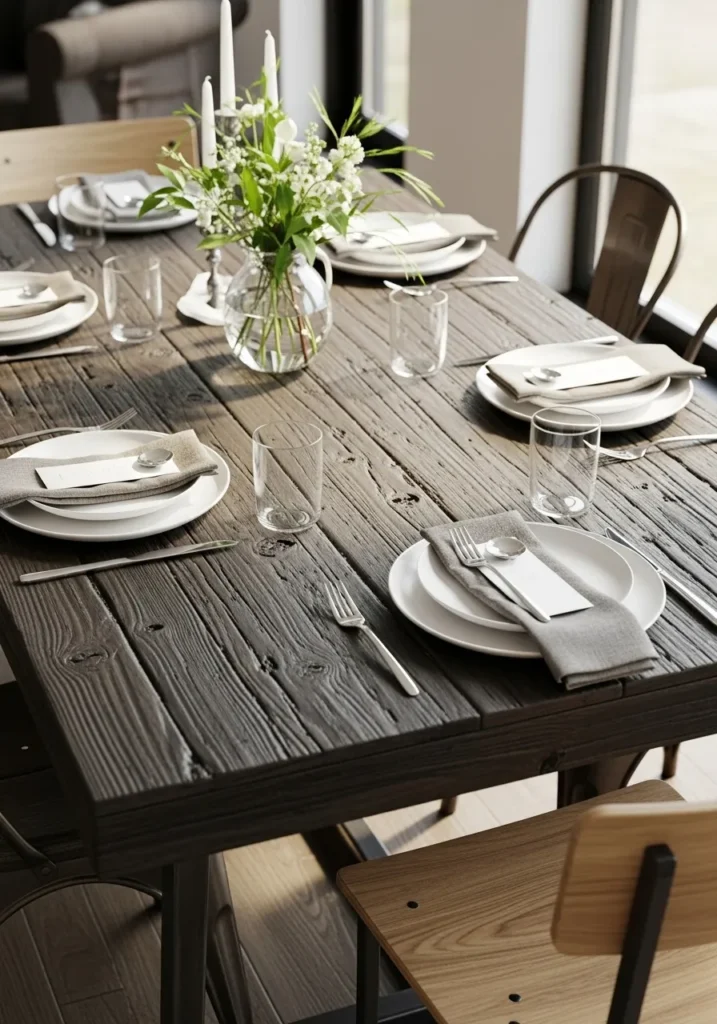 This dining table features a darker wood finish with visible texture that adds depth and character. Paired with simple place settings and a soft centerpiece, the table feels relaxed and welcoming. Natural light enhances the texture and gives the room a lived in feel.