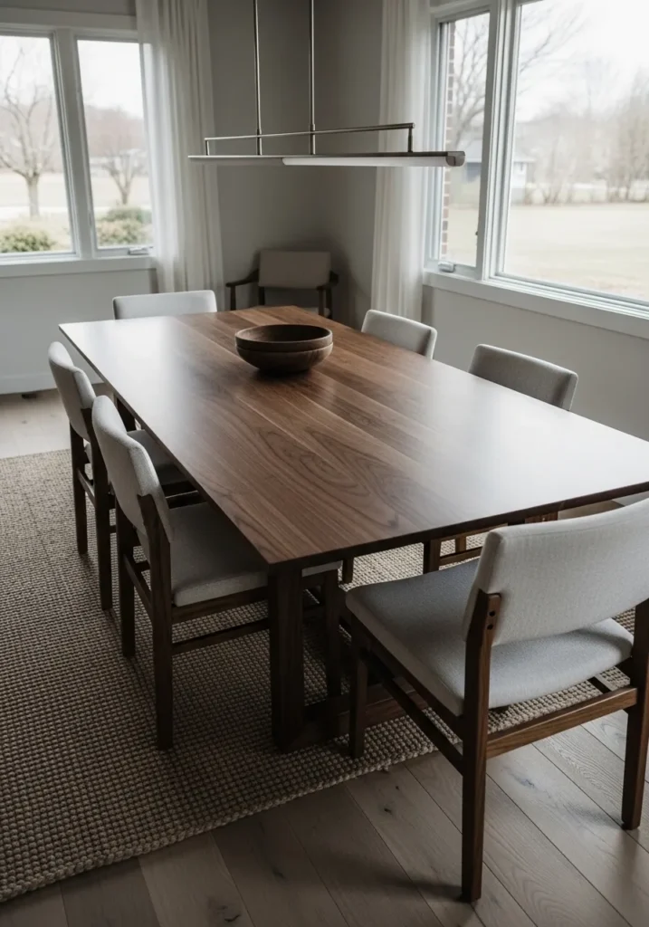 This dining space centers around a rich dark wood table with a smooth surface and clean edges, framed by soft natural light coming through the windows that gently balances the depth of the wood and keeps the room feeling open and calm. Simple upholstered chairs add comfort without stealing focus, creating a look that feels timeless, warm, and easy to live with.