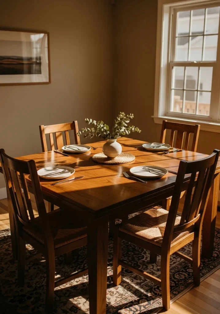 This dining setup features a compact dark wood table paired with woven chairs that add texture and warmth. Soft light from nearby windows highlights the tabletop and creates a relaxed and intimate atmosphere. A simple centerpiece keeps the look grounded and natural without overwhelming the space.