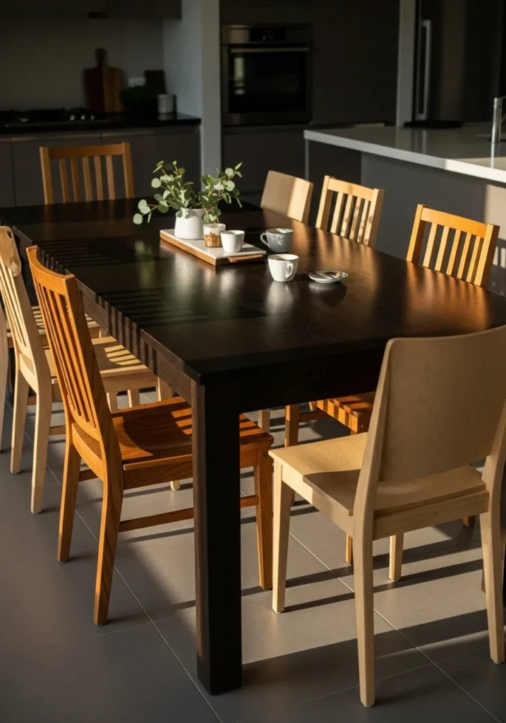 I love how this setup feels quietly confident and inviting at the same time. The dark wood brings warmth, but the light keeps everything from feeling heavy, which makes it look like the kind of table where quick meals slowly turn into long conversations without anyone noticing the time.