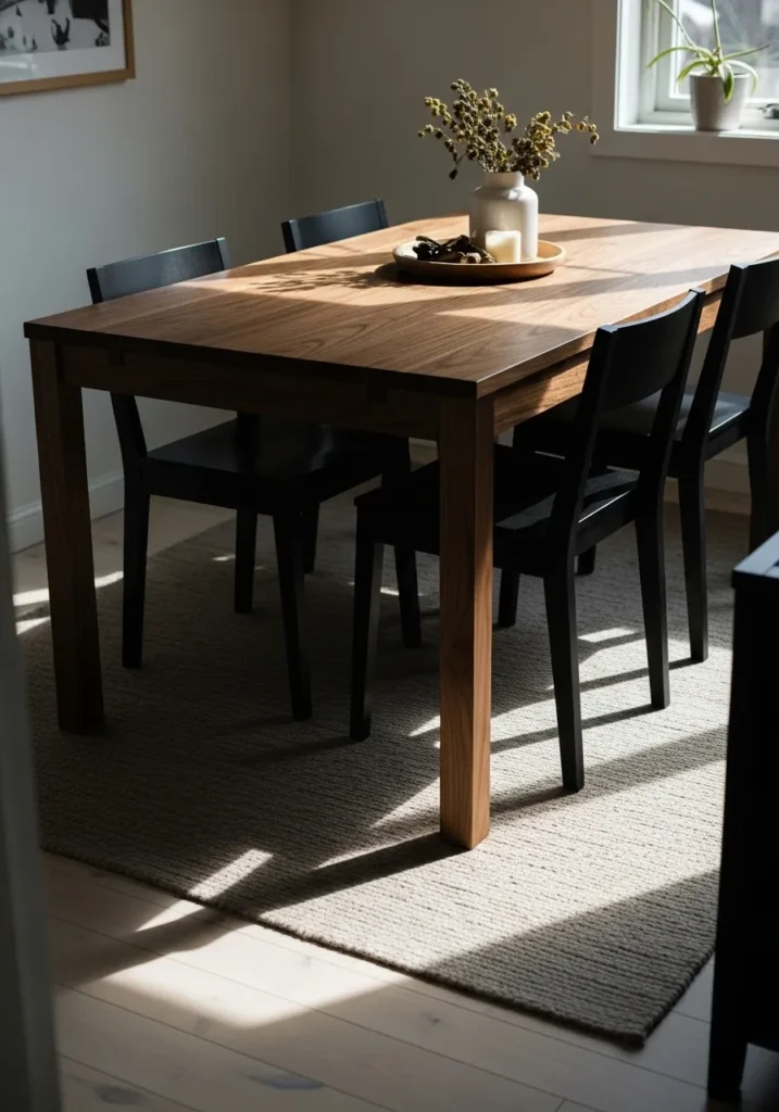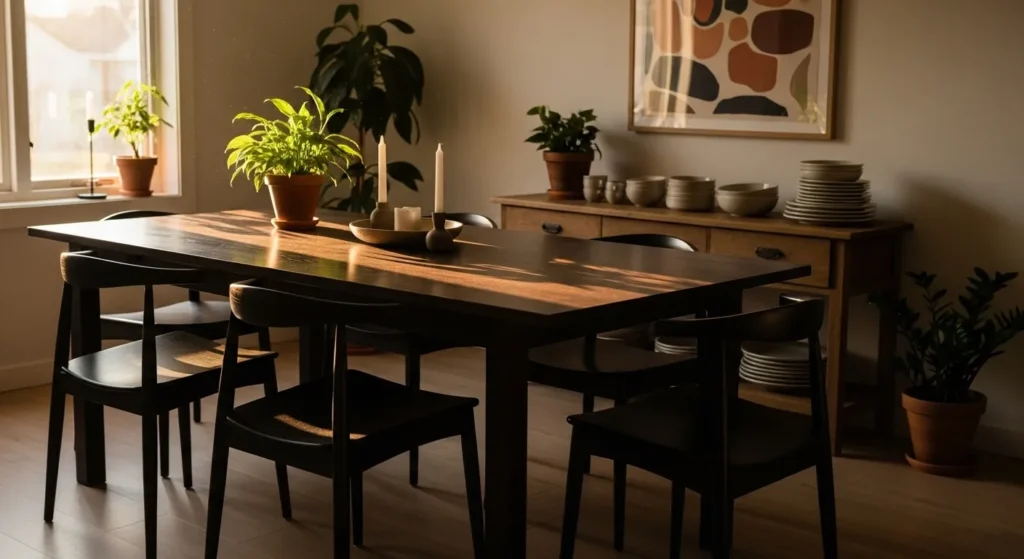 I really appreciate how calm and balanced this space feels. The dark wood brings depth without making the room feel small, and the simplicity makes it easy to imagine using this table every single day without it ever feeling boring.