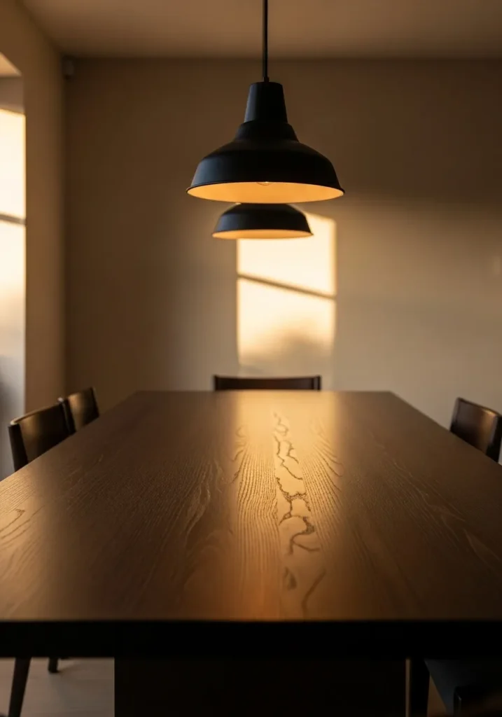 This dining space leans into a moody atmosphere with a dark wood table placed beneath a bold pendant light that casts a warm glow across the surface. The lighting highlights the wood grain beautifully while the simple surroundings keep the focus on texture and depth.