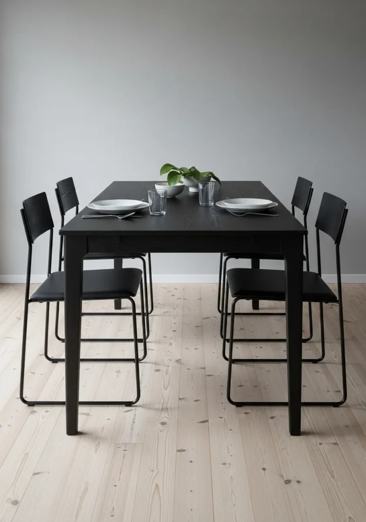 I really like how fresh and effortless this setup feels. The contrast between the dark wood and black chairs looks bold without being heavy. It feels like a space that works just as well for everyday meals as it does for casual gatherings with friends.