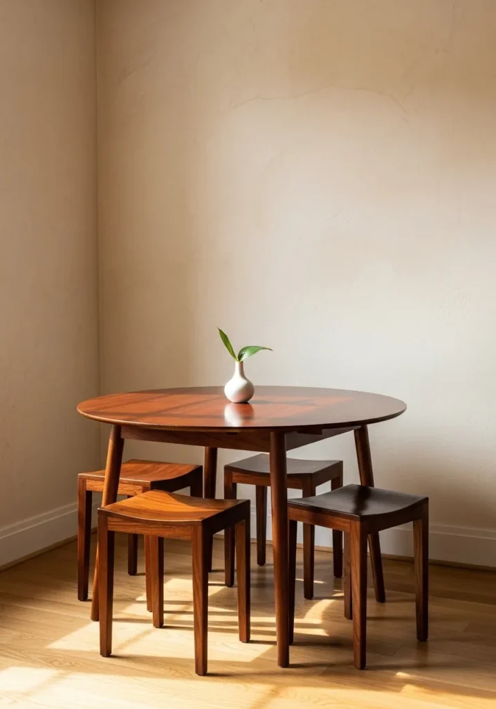 This smaller dining setup uses a round dark wood table tucked into a cozy corner, with matching chairs that keep the look warm and cohesive. Soft light and simple decor make the space feel intimate and perfectly suited for smaller homes or quiet daily moments.