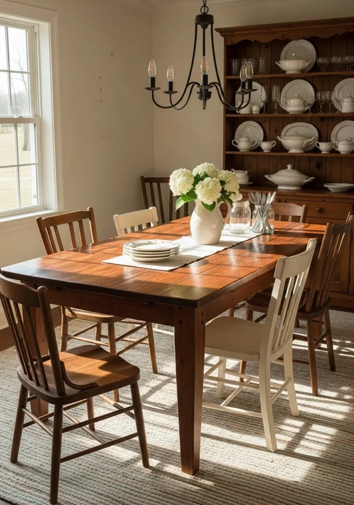 This dining room showcases a classic dark wood table paired with a mix of wooden chairs that add character and charm. A vintage cabinet filled with dishes and a simple chandelier complete the look, giving the space a collected and timeless feel. The table sits comfortably in the room, grounded and inviting without feeling formal.