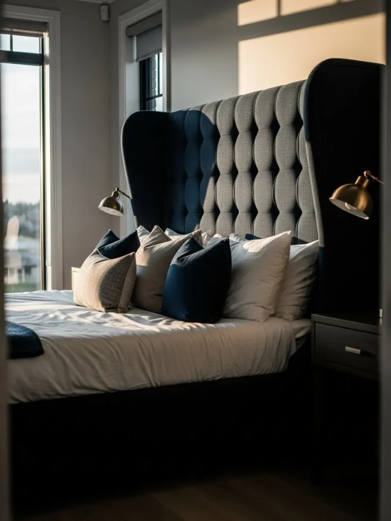 This bed frame instantly draws the eye with its tall wingback headboard and deep tufted upholstery. The rich fabric adds texture and depth while the high sides create a cozy cocoon effect around the bed. Paired with layered pillows and soft lighting, the whole setup feels polished dramatic and intentionally styled without feeling overwhelming.