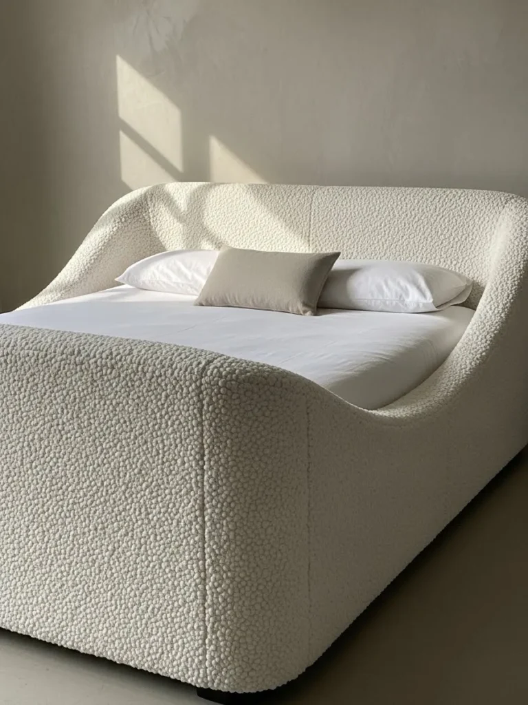 Honestly, when I saw this, I immediately wanted to curl up with a good book and a giant mug of tea. I am just obsessed with how the light catches those tiny loops in the bouclé fabric making the whole thing glow. It’s such a sophisticated take on comfort, right If you’re looking to add a serious dose of softness and sculptural elegance to your sanctuary, this frame is absolutely winning the bedroom game. It feels luxurious without being fussy at all.