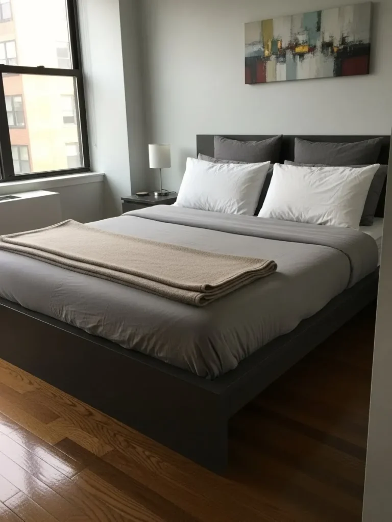This bed frame is the epitome of minimalist urban cool featuring a low-to-the-ground platform design in a deep charcoal or espresso finish. Its simple clean lines offer a grounded, sophisticated foundation for the bedding which layers soft grey linens with bright white pillows and a warm tan throw for just a touch of contrast. Set against pale gray walls and juxtaposed with glossy warm wood floors and a large window showing a city view this look nails modern simplicity. The overall aesthetic is calming intentional and very tailored.