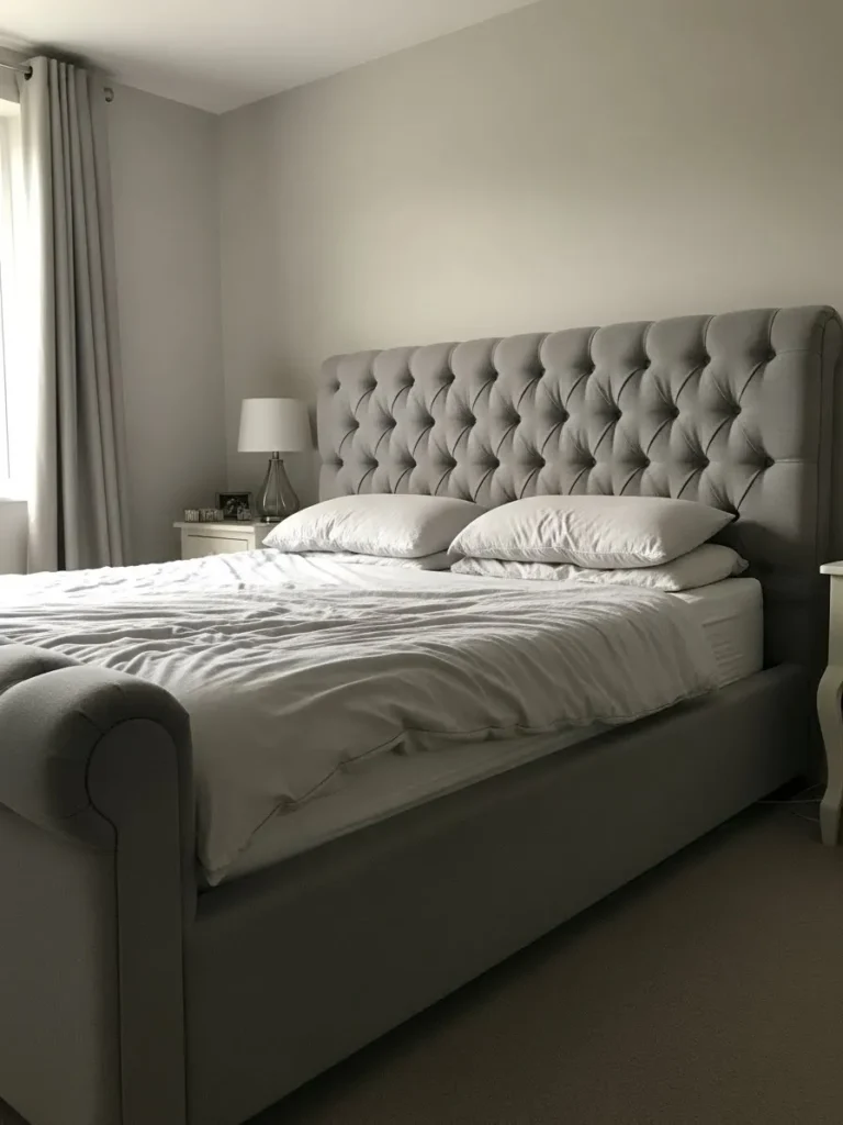This bedroom showcases a truly luxurious upholstered bed frame, defined by its classic sleigh bed silhouette featuring beautifully scrolled footboard ends. The entire frame is enveloped in a soft, muted grey fabric, which is dramatically enhanced by deep diamond tufting across the generously sized headboard. Paired with simple white bedding, the texture and stately shape of the bed become the undeniable focal point, lending an air of refined elegance to the softly lit space.