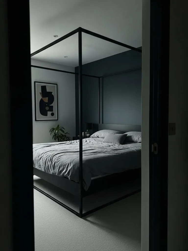I am totally captivated by how this frame defines the space in such a minimal way It’s like having your own modern room within a room, perfect for creating a cozy, somewhat private sleeping nook even in a large space If you love that moody, sophisticated, almost industrial vibe but want to keep things feeling open and airy, this clean-lined canopy is brilliant. It truly elevates the entire bedroom just by existing.
