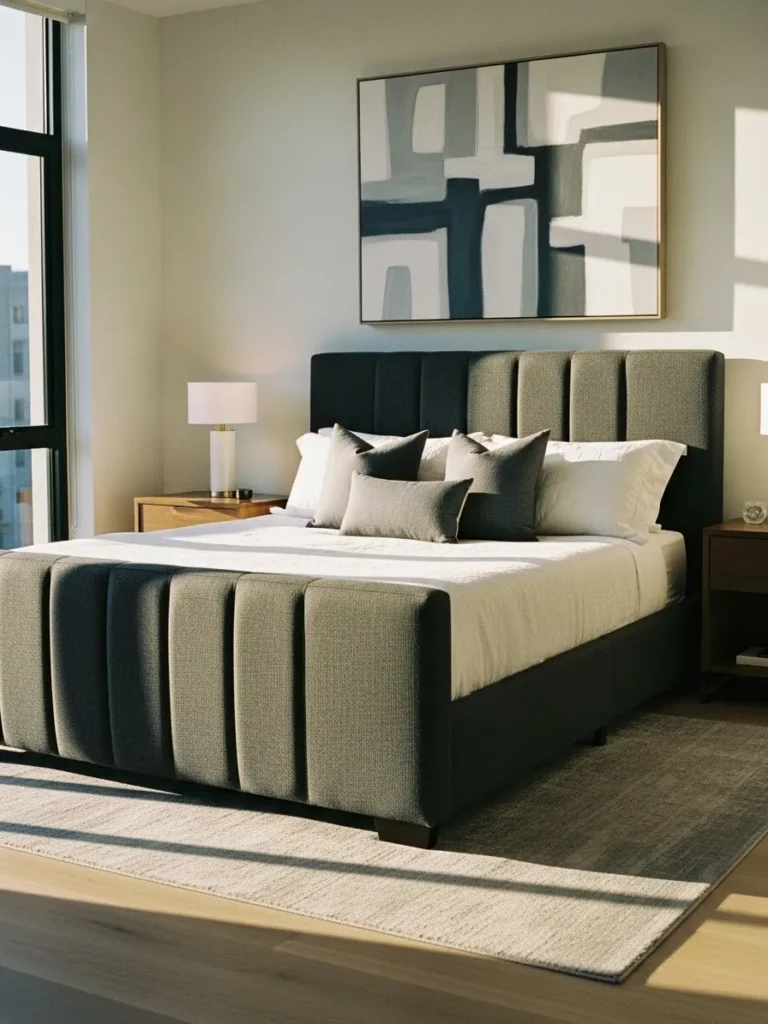 This bed frame leans fully into modern elegance with its plush upholstered design and tall padded headboard. The deep neutral fabric feels soft and structured at the same time while the clean lines keep the look polished and uncluttered. Paired with crisp bedding, simple nightstands, and abstract wall art, the whole setup feels calm, intentional, and perfectly suited for a modern city bedroom.