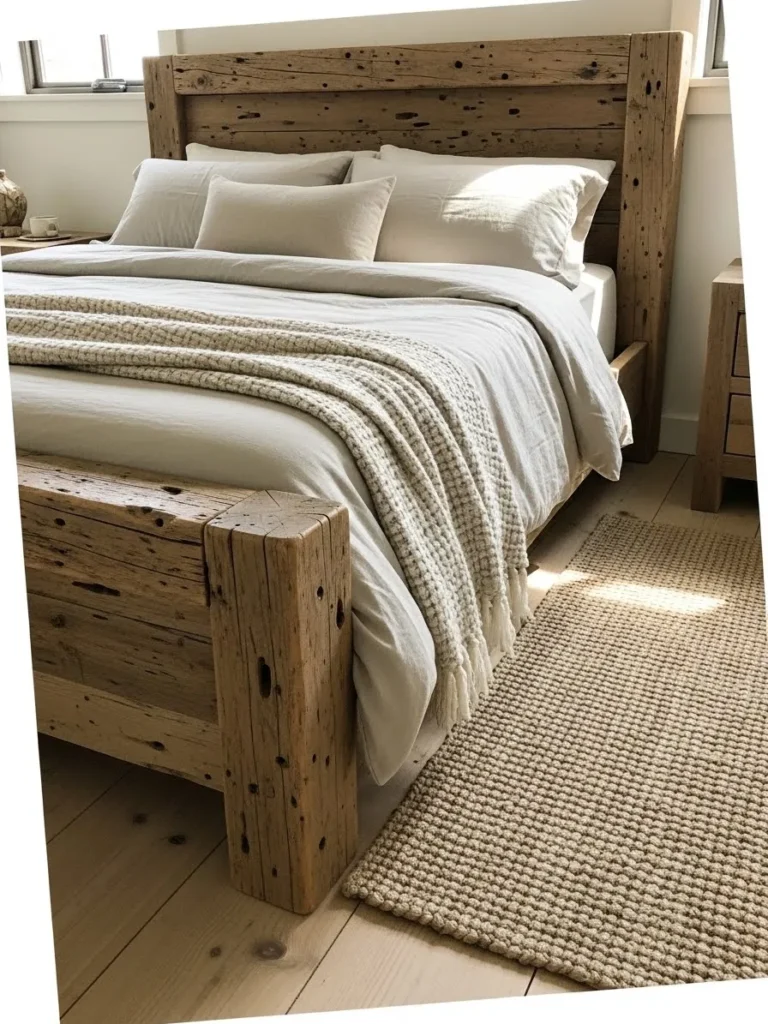 This bed frame is all about embracing texture and history, crafted from substantial pieces of noticeably reclaimed wood. The headboard and footboard posts feature thick, chunky timber with authentic distressing knots and natural holes that give it incredible character. The overall effect is wonderfully rustic, perfectly balanced by the soft, light wood flooring and the layered, muted bedding in shades of cream and oat. A nubby, natural fiber rug anchors the look beautifully completing this organic, farmhouse-inspired sanctuary.