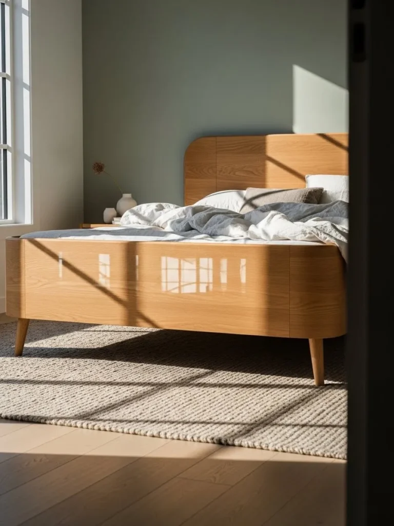 This bed frame highlights smooth natural wood with gently rounded edges and tapered legs that give it a light Scandinavian feel. The low profile keeps the room feeling open while the warm wood tone adds just enough richness to balance the soft neutral bedding. Sunlight bouncing across the frame makes the whole setup feel calm and thoughtfully designed without feeling overly styled.