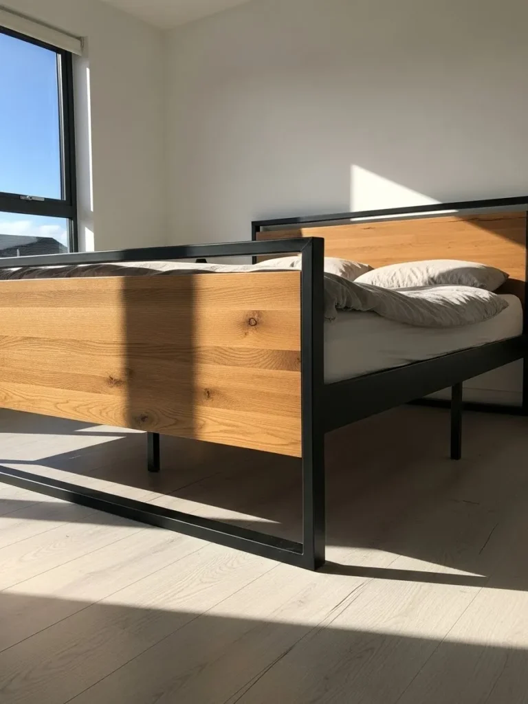 This bed frame blends warm natural wood panels with a strong black metal structure for a look that feels modern and slightly industrial. The open frame keeps the room feeling airy while the solid wood headboard and footboard add texture and depth. Clean lines and simple materials give it a confident presence without overpowering the space.