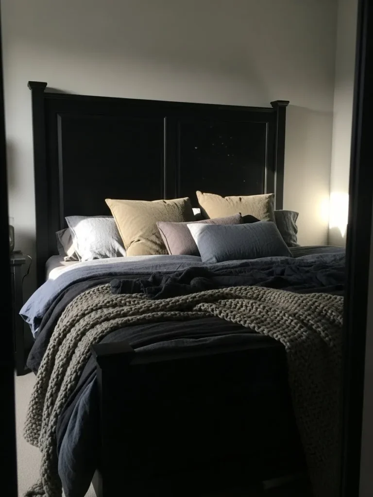 I really love this style because it feels dramatic in the best way. The black frame makes the bed feel like the true centerpiece of the room and it instantly adds depth and warmth. It gives off that snug end of day feeling that makes you want to turn the lights low and relax. This is the kind of bed that makes a bedroom feel safe calm and perfectly tucked in.
