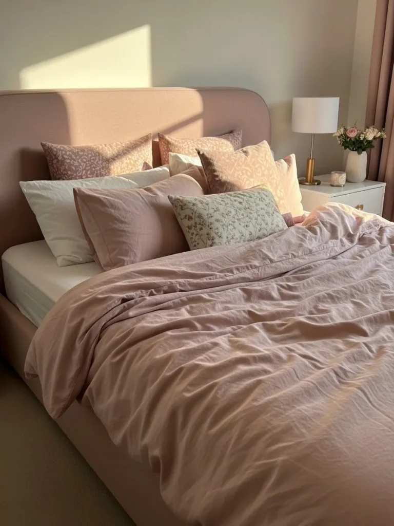 I absolutely love how calming this bed feels the moment you see it. The blush shade adds warmth without being too sweet and it makes the whole space feel thoughtfully styled. This is the kind of bed that feels cozy but still polished and it instantly makes the bedroom feel like a little personal retreat. It is soft pretty and perfectly comforting in all the right ways.
