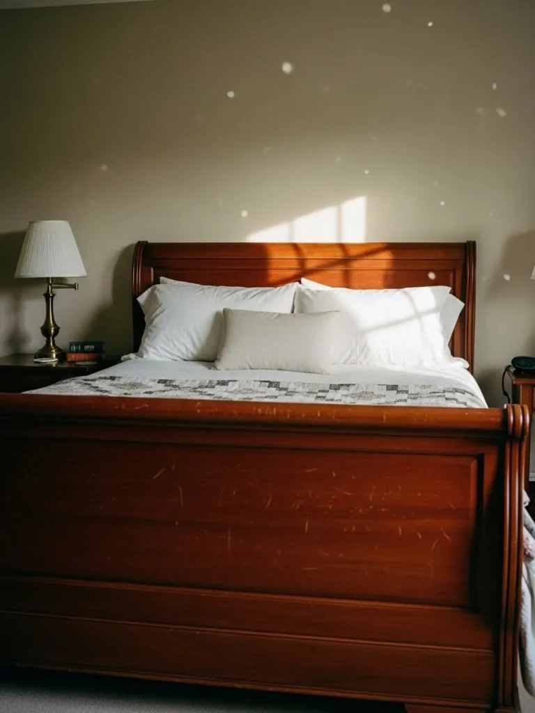 This bed frame features rich wooden tones and classic detailing that give it a warm and familiar presence. The solid headboard and footboard create a sense of structure while the smooth finish keeps it feeling polished and well cared for. Soft neutral bedding and simple bedside lamps balance the deeper wood color and keep the room feeling calm and inviting.
